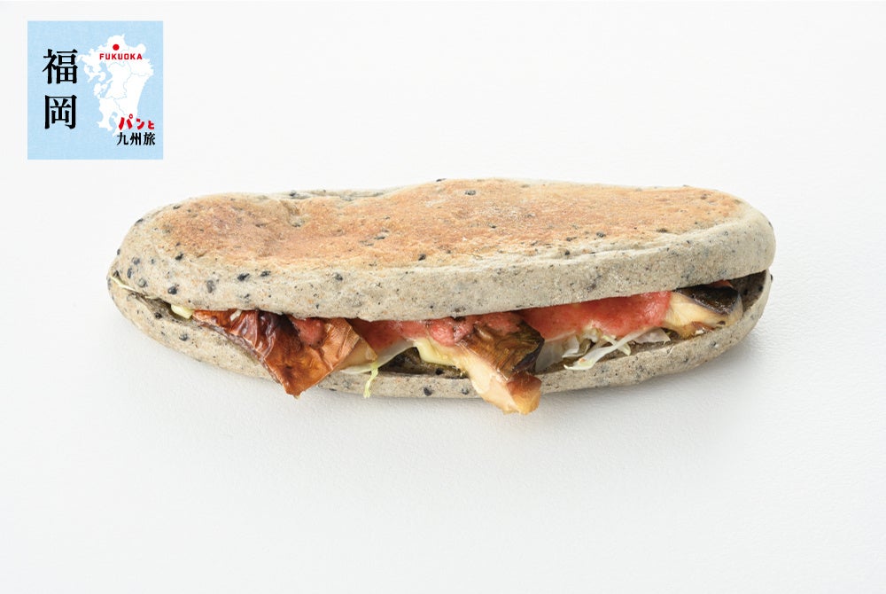 黒ごま入りのパンに、塩焼きした鯖と明太子フィリング、キャベツをはさんで焼き上げました。