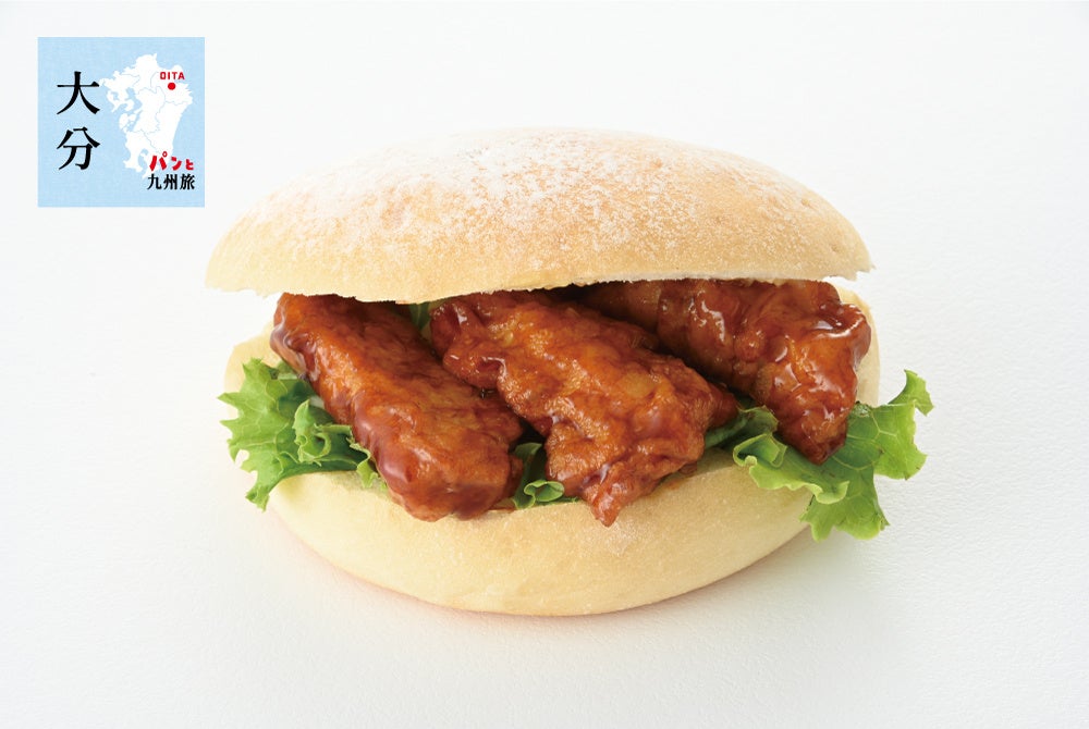 ソフトなパンに、甘酢ダレをからめたとり天をサンド。青柚子と青唐辛子をかけ合わせた、さわやかな辛みの青ゆず胡椒を合わせました。
