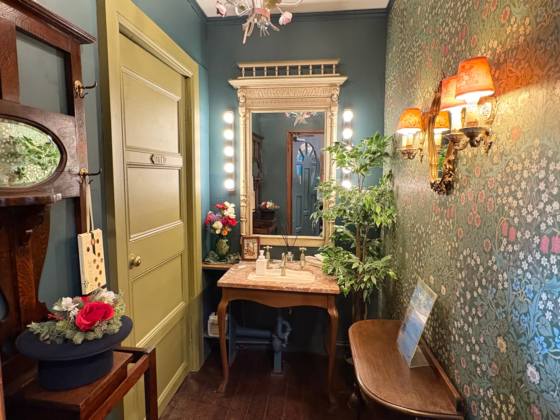 ウィリアム・モリスの壁紙「ブラックトーン」を使用した空間は、まるでモリスの森の中に迷い込んだかのように、英国らしい魅力が漂います。ドレッシングルームの壁面にはモリスの世界観を最大限に引き出すアンティークの演出で照明や小物、細部に至るまでこだわり抜かれた空間に生まれ変わりました。ケントファクトリーの技術を駆使し、アンティーク家具をいかした実用的な洗面台や、アンティークのドアも必見。