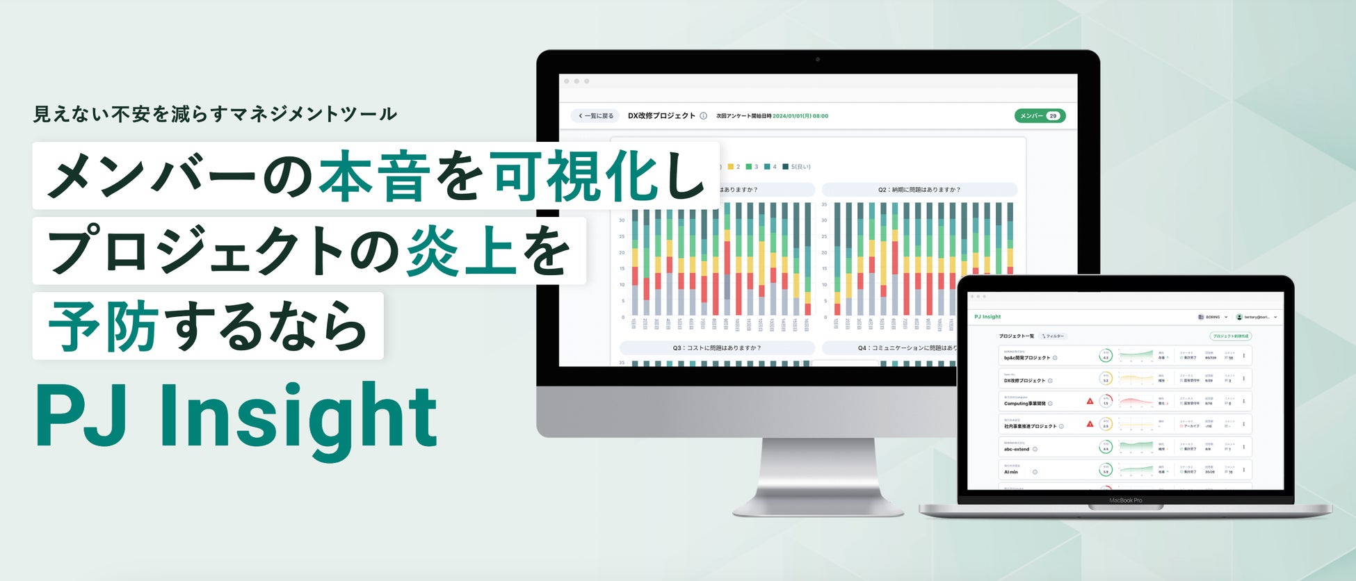 「PJ Insight」は、従来の進捗管理手法では難しかったプロジェクトに対するメンバーの本音や不安を収集し、時系列データとして可視化する一風変わったプロジェクトマネジメントツールです。