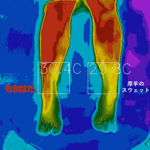 赤いところが温かいところ。もちはだの方が比較的赤い部分が多く、表面温度がテスト前と変わらない30℃前後をキープしていることがわかります。その差は約2℃も。