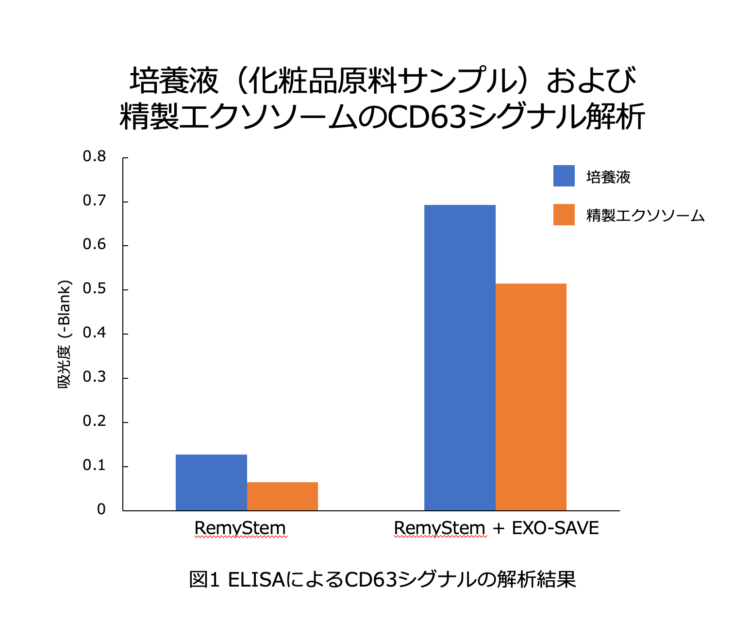 EXO-SAVE は、培地の成分調整を行うことで、エクソソームや成長因子が容器に付着することを防止し、凍結によるタンパク質の破壊もある程度抑制することができる。通常のヒト幹細胞培養液『RemyStem』に EXO-SAVE を用いると、エクソソームの含有量は約 7 倍にもなる。他社製品も含めて、リポソームなどの成分保護の加工をしていないヒト幹細胞培養液原料は、容器への付着などによって 80%程度のエクソソームや成長因子をロスしていたことになる。これは容器を移し替えるたびに起こるので、原料を移し替えることで、8割ずつ機能性成分を失う可能性がある。EXO-SAVE は最低限の加工で、機能性成分を約 7 倍にする。同じ配合量であればより強い体感の化粧品を作ることを可能にする原料だ。