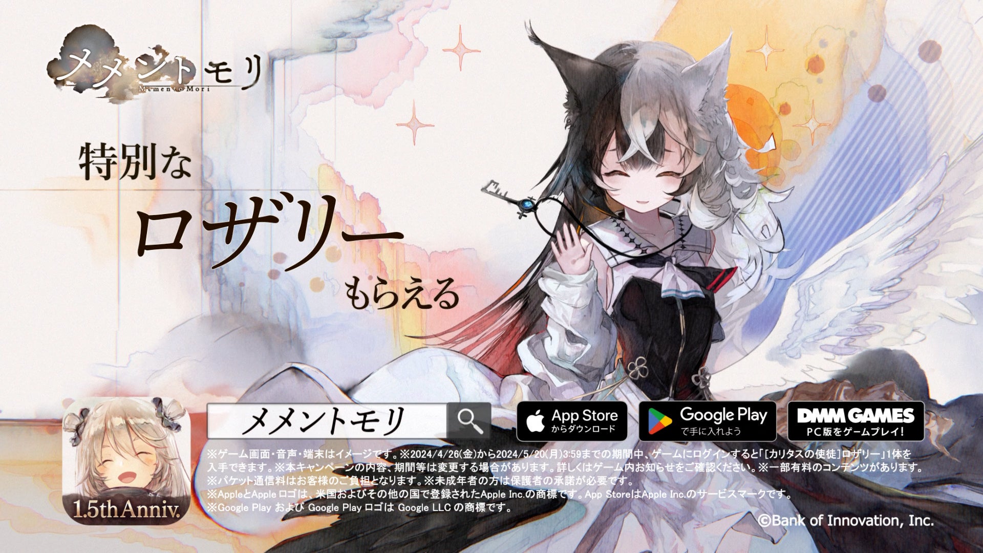1.5周年を記念して、『メメントモリ』をプレイしていただいた方全員に、新魔女「[カリタスの使徒]ロザリー」(CV 上坂すみれ/Song by 山本彩)」をゲーム内にて期間限定でプレゼントいたします。