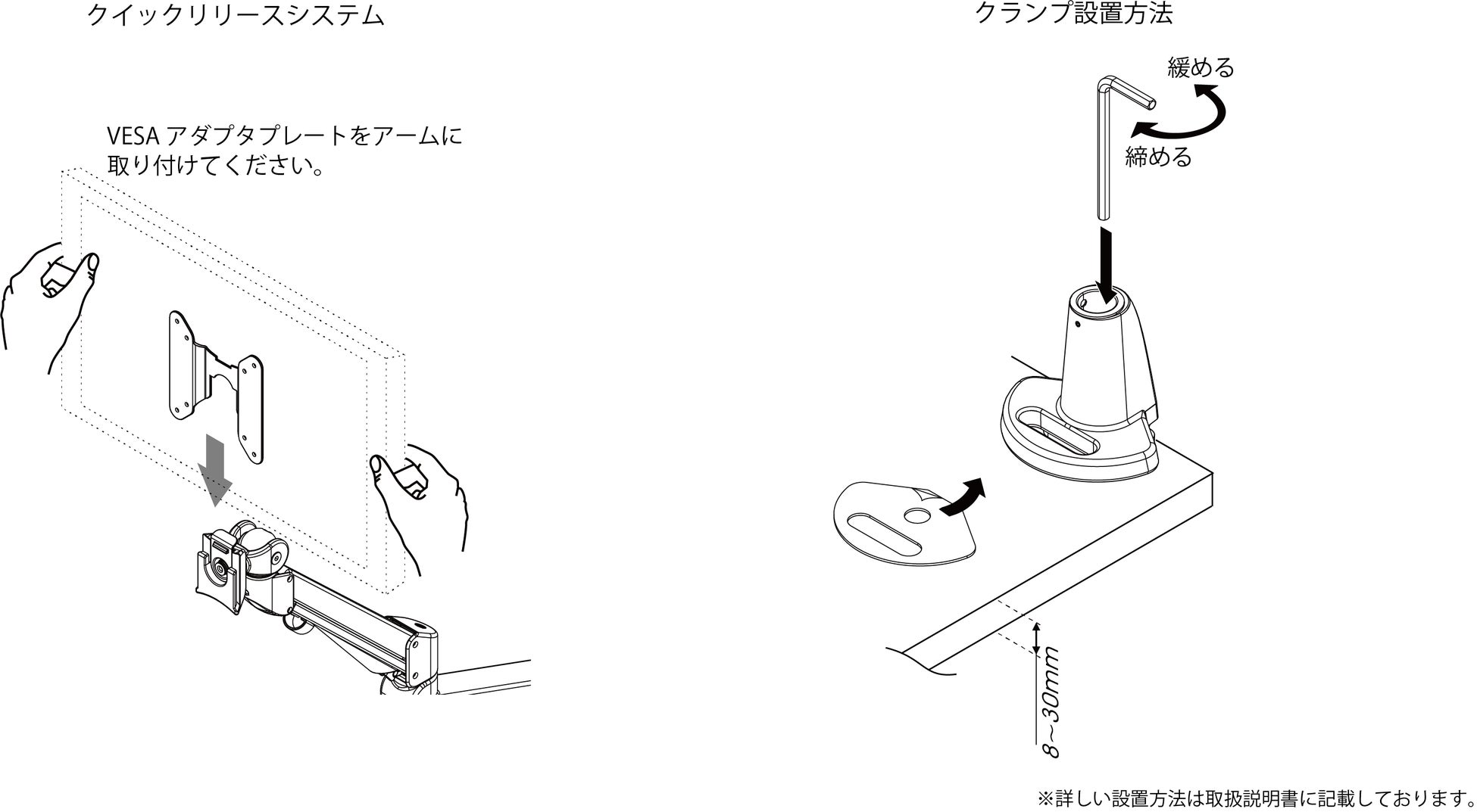 アームにモニターを取り付ける際にワンタッチで取り付け可能。又、デスクに取り付けるクランプはレンチで約1回転半締めるだけで簡単に固定されます。力が必要な作業ではないので、女性でも簡単に取り付け出来ます。