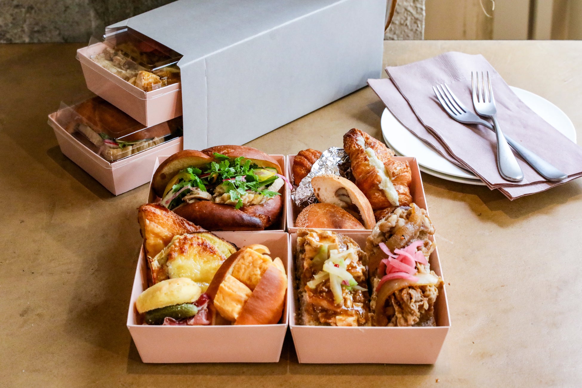 BOX D:さつまいもとラクレットチーズのパンキッシュ / ミニ塩パン×西京味噌バターのだしまき卵 / 生ハムとコルニッションのミニメロンパン