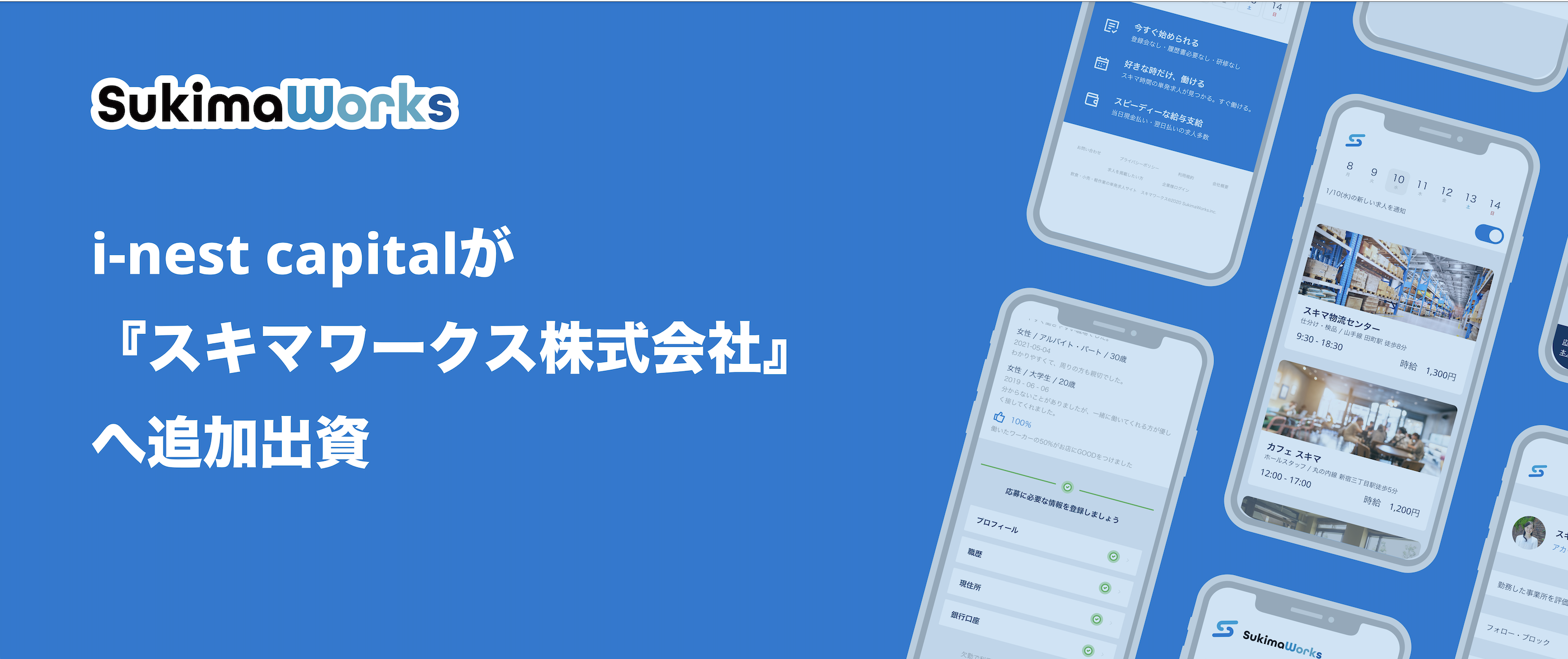 スキマ時間に働ける単発アルバイトマッチングサイト「sukima works (スキマワークス)」(以下、「スキマワークス」)を運営するスキマワークス株式会社(本社:東京都港区、 代表取締役兼CEO:赤荻 心)は、2022年5⽉31⽇に既存投資家のi-nest capital株式会社(読み:アイ・ネスト・キャピタル、本社:東京都目黒区、代表:山中卓、以下 i-nest capital)から資金調達を実施しました。