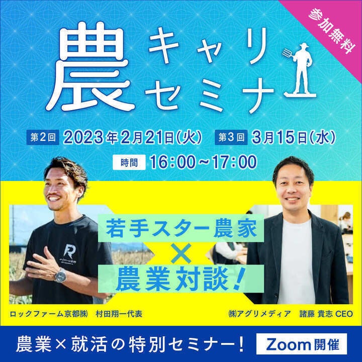日本有数の知名度を誇る農業法人の代表をお招きし、弊社社長の諸藤と農業談義を交わす対談企画と、農業界における就活情報や自己分析・面接等の就活対策を併せてご紹介するセミナー企画が学べるイベントとなっております。