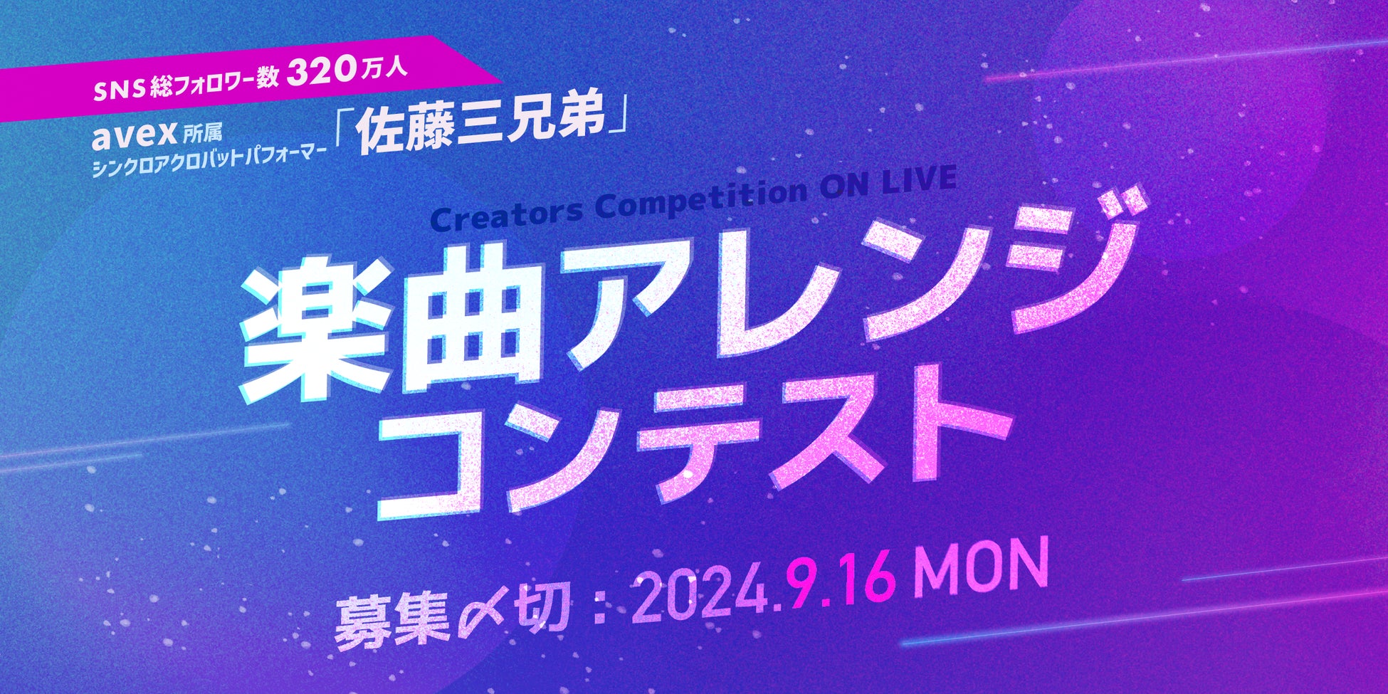 初回として、SNS 総フォロワー数 320 万人、avex 所属のシンクロアクロバットパフォーマー・佐藤三兄弟初のオリジナル楽曲となるコンテストを開催中です。