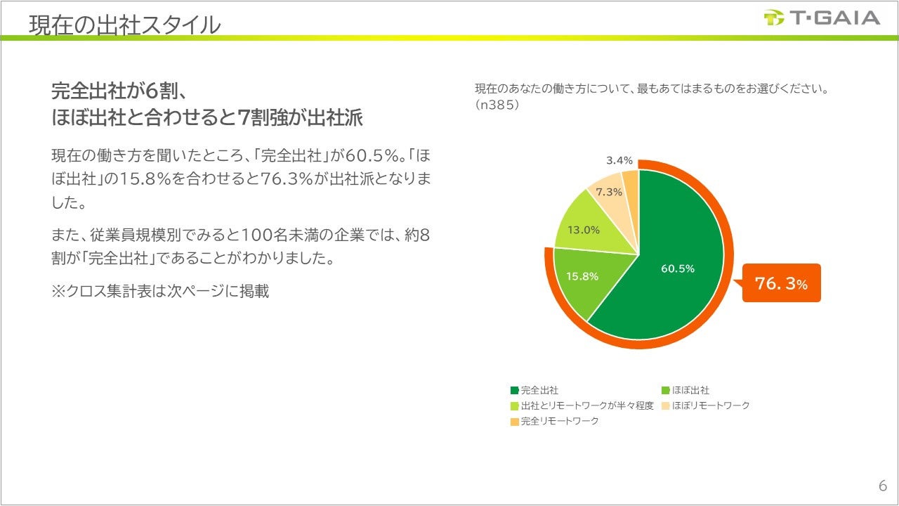 1. 完全出社が6割、ほぼ出社と合わせると7割強が出社派