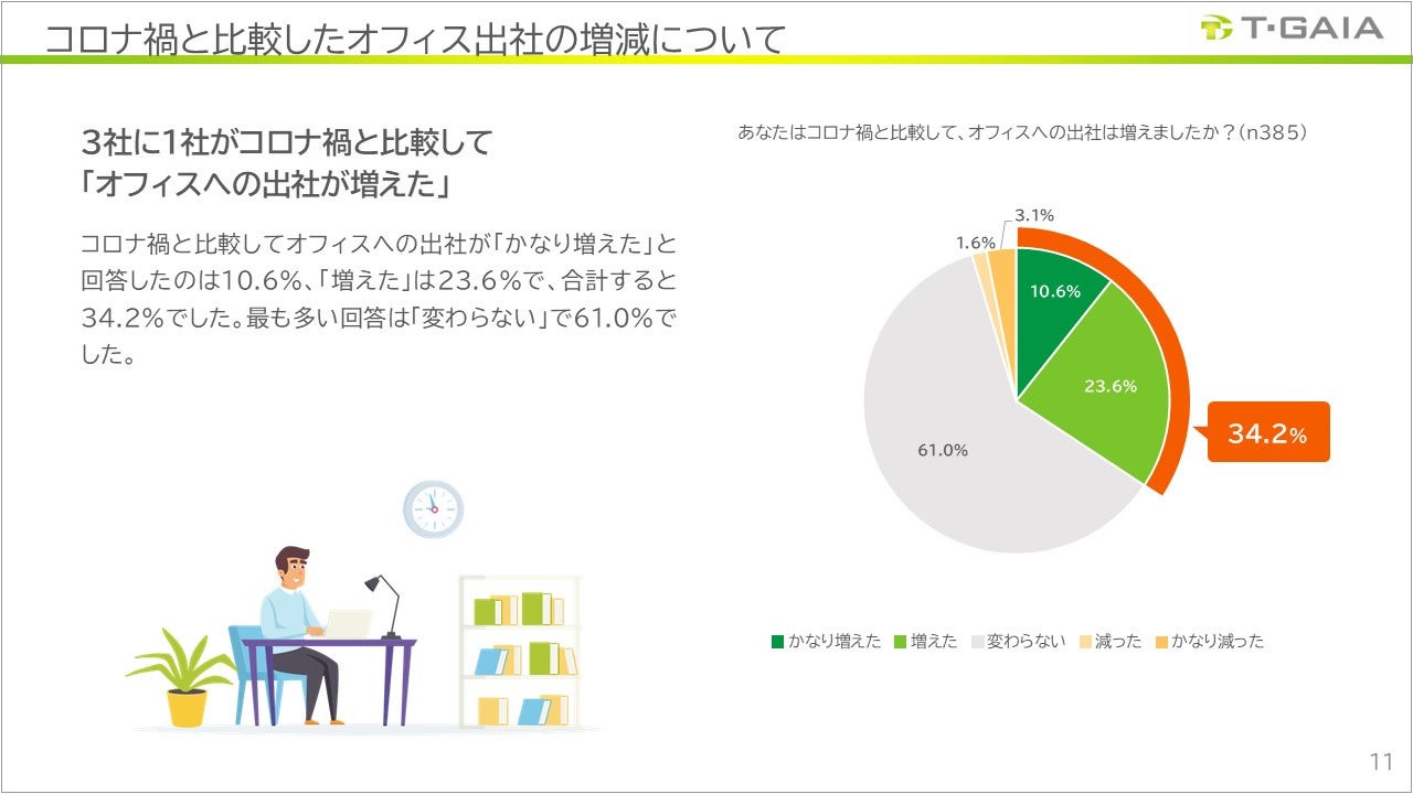 コロナ禍と比較してオフィスへの出社が「かなり増えた」と回答したのは10.6%、「増えた」は23.6%で、合計すると34.2%でした。最も多い回答は「変わらない」で61.0%でした。