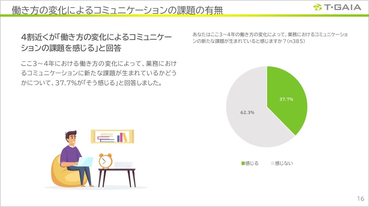 ここ3~4年における働き方の変化によって、業務におけるコミュニケーションに新たな課題が生まれているかどうかについて、37.7%が「そう感じる」と回答しました。