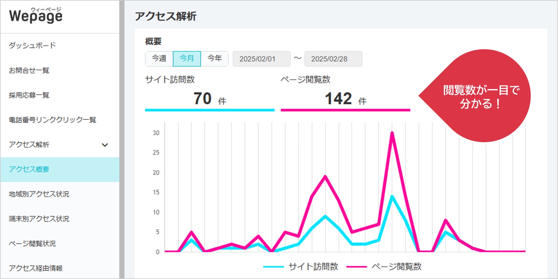 何回閲覧されたかが一目でわかり、ホームページの効果を実感!人気のページやアクセス経路などから、より閲覧数を増やすヒントを得られます。