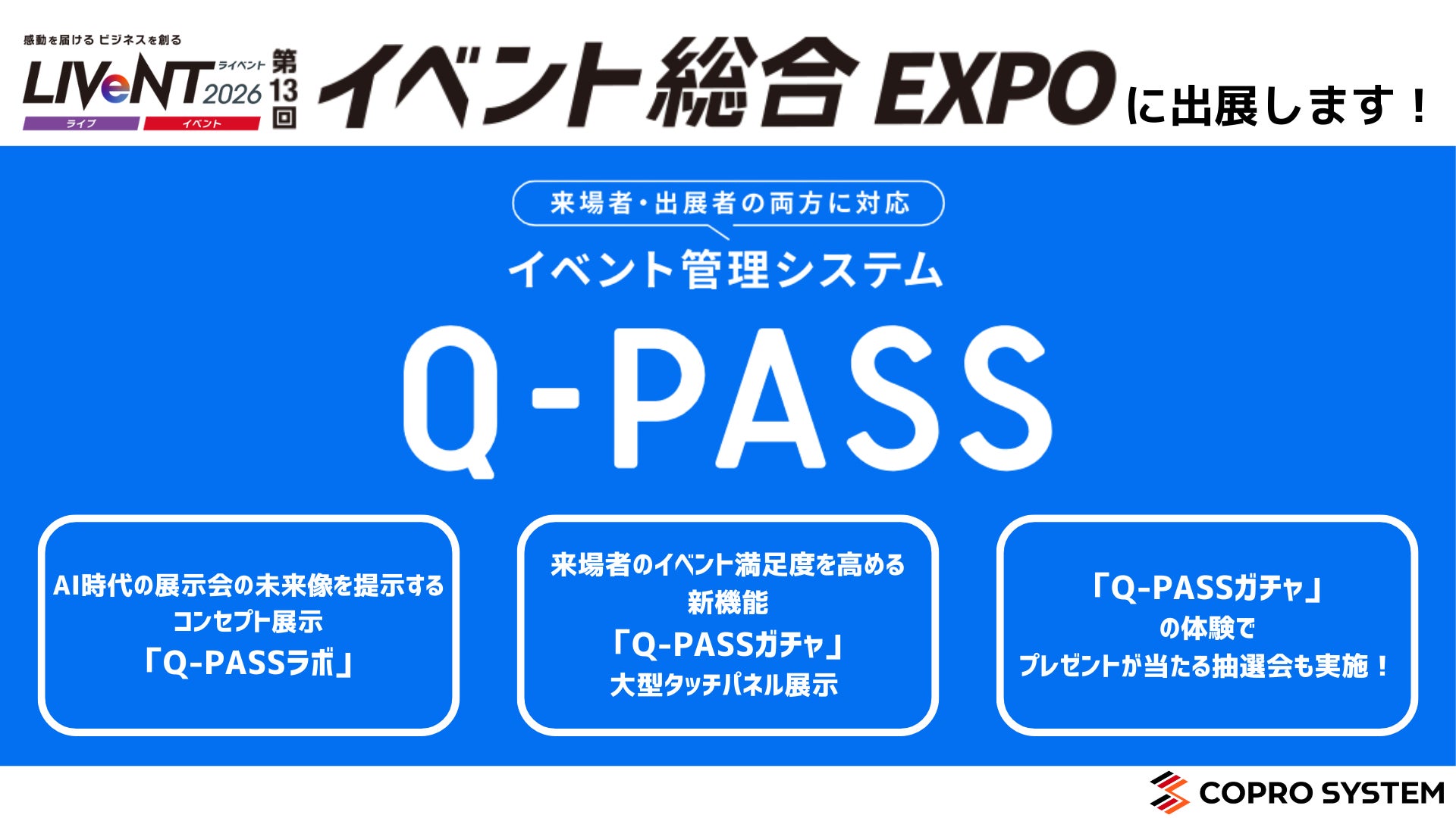 株式会社コプロシステム(本社:東京都品川区、代表取締役社長:金田 浩邦、創業:1998年)は、2026年1月21日(水)から23日(金)まで幕張メッセで開催される総合展示会「LIVeNT」内の「イベント総合EXPO 2026」に出展いたします。