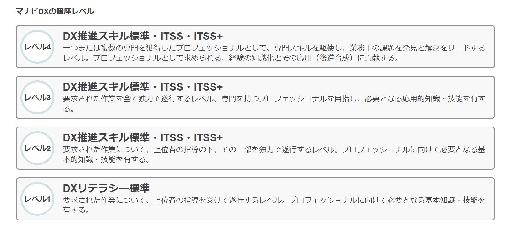 「マナビ DX」は、経済産業省と独立行政法人情報処理推進機構 (IPA)が運営するデジタル人材育成プラットフォームです。デジタルスキル標準 (DSS) などのスキル標準への対応を経済産業省・IPA が審査し、合格した講座のみが掲載されています。