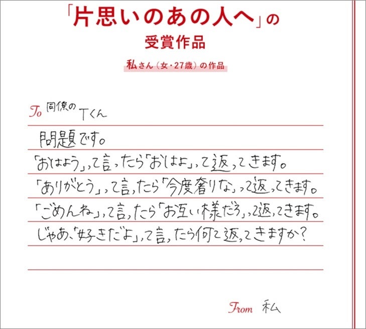 昨年度受賞作品「片思いのあの人へ」のラブレター 私 さん(女・27歳)の作品