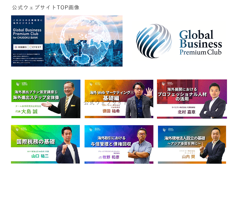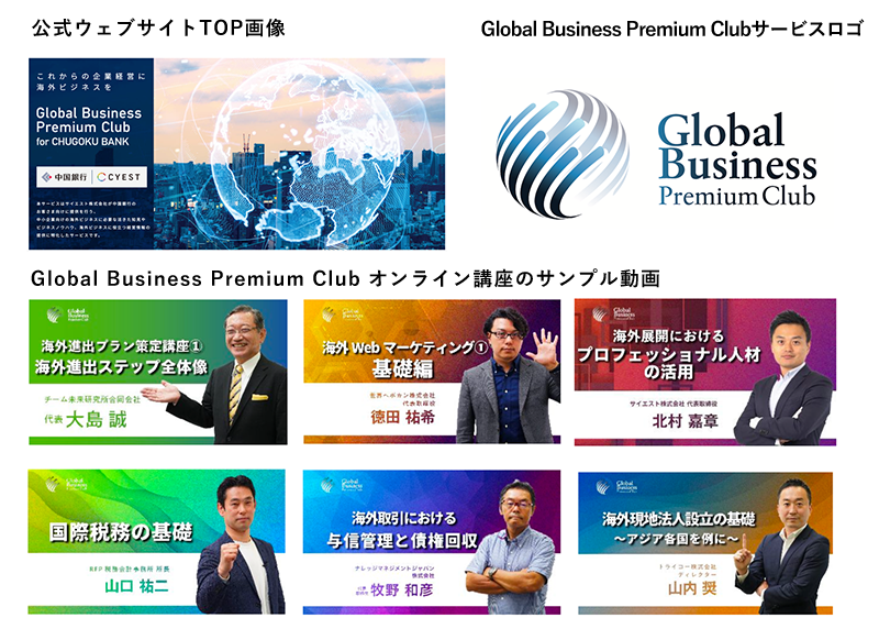 当社と中国銀行で共同開発した「Global Business Premium Club For CHUGOKU BANK」は、当社に登録いただいている海外ビジネスの第一線で活躍してきた5000名のプロフェッショナル人材の活きた知見とノウハウをベースに海外ビジネスを中心とした企業経営に役立つ実践ノウハウや有益な経営情報を提供する会員制海外ビジネスのサブスクリプション型コンサルティングサービスです。