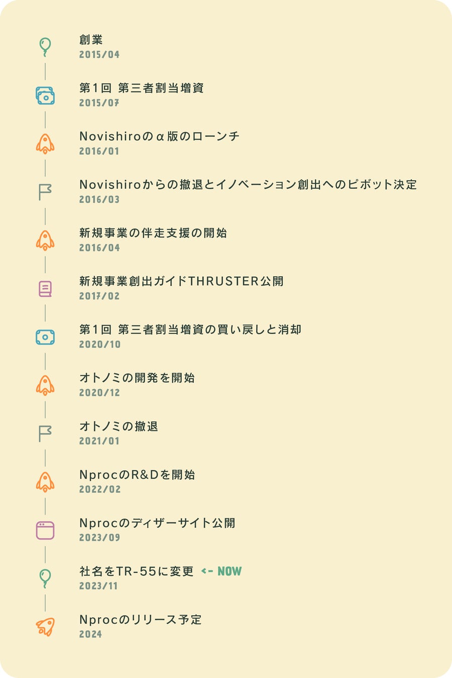 Nprocは「ホワイトボードの上でリアルタイムで共同編集可能なエディターやテーブルを使用しながら意思決定データを運用できるようにした上で商業利用を可能とする」という難しい挑戦ではあったものの2024年内のリリースの目処が立ってきたことから、イノベーション創出支援とコラボレーション支援を包含できる新たな目的の必要性が生まれ社名変更に至ったものです。