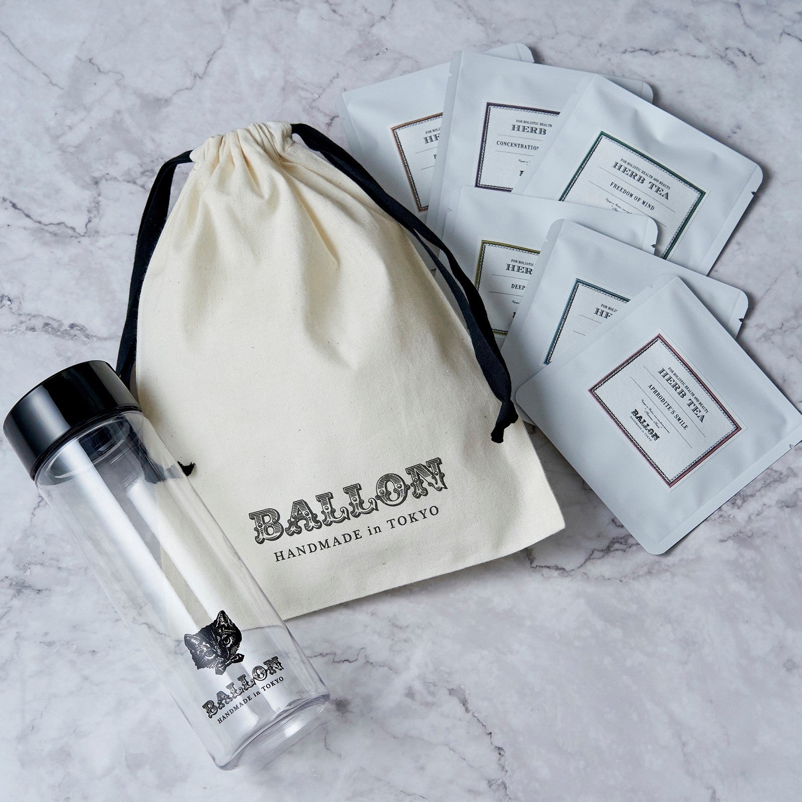 ハーブティー6種各1包、ボトル(“BALLON”もしくは“ねこ”の2種からお選びいただけます)、オリジナル巾着ポーチ