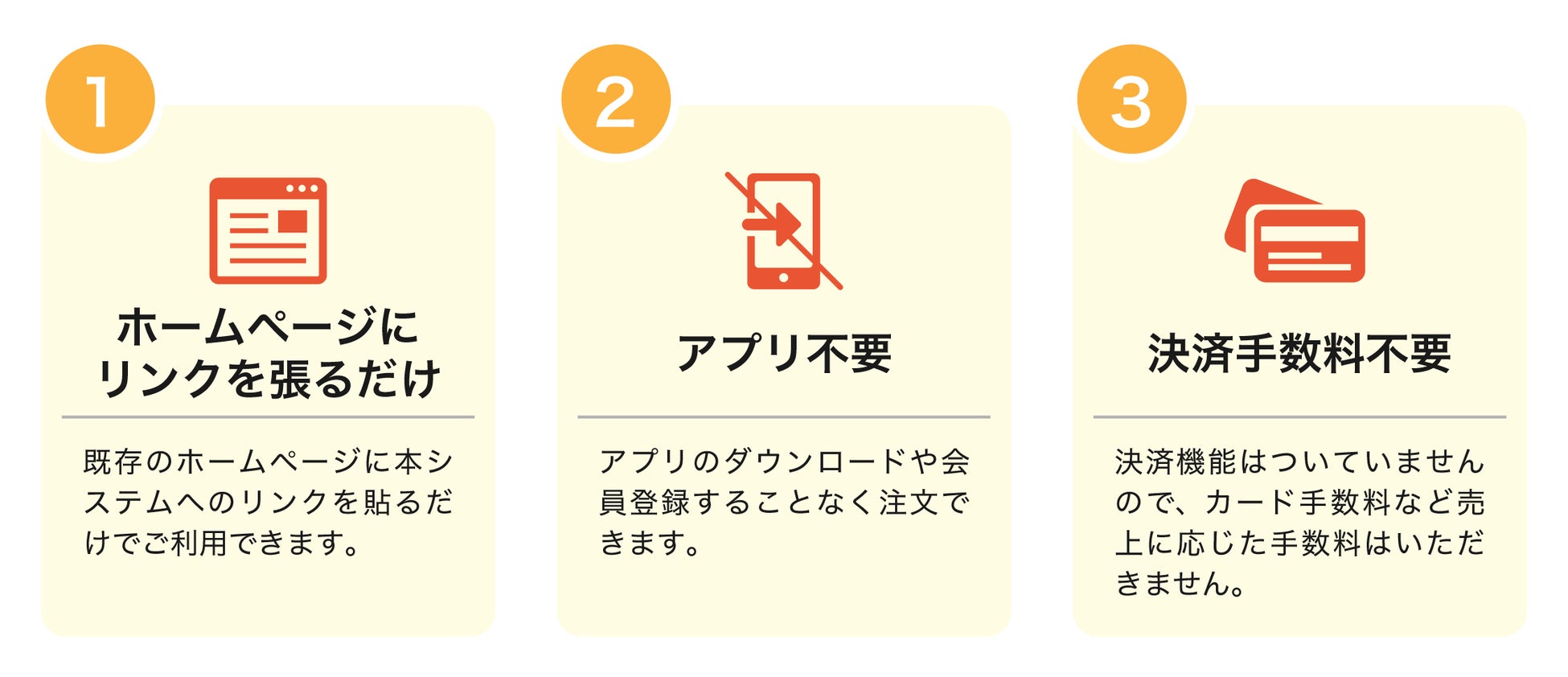 テイクアウトやデリバリーのプラットフォームとは異なり、ユーザーは注文時にアプリのダウンロードや会員登録することなく注文できます。店舗スタッフは注文情報をタブレット端末などで一元管理できるほか、注文内容をメールで通知する機能も備えています。また、決済機能は無いため決済手数料や販売手数料などのコストをかけずに運用できます。