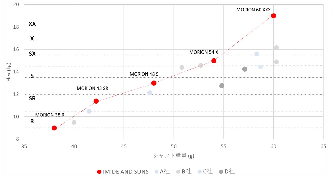 <MORIONと他社製品のスペック比較(重量とFLEX)>