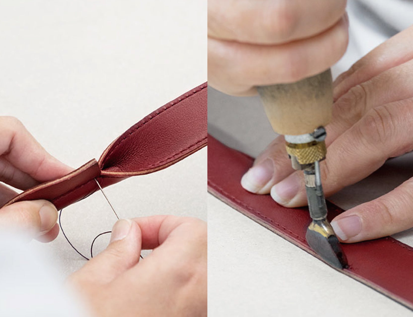 カーフを、細いストラップ状に緻密なステッチが施されます。そのプリーツは、デザイナーのパターンに沿って、バッグの形に関連して施されます。