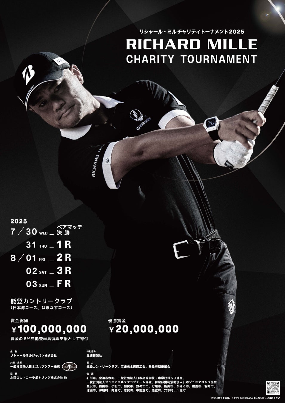 本大会は、2025年7月31日(木)~8月3日(日)の4日間、石川県羽咋郡宝達志水町の能登カントリークラブ(日本海コース、はまなすコース)にて開催します。トーナメントタイトルにもあるようにチャリティ活動を積極的に行う大会として、令和6年能登半島地震・豪雨の被災地支援やジュニアゴルファー育成など、リシャール・ミルとJGTOが協力し様々な活動を行います。ジャパンゴルフツアー選手会からの申し出により、賞金の5%を被災地支援に寄付いたします。大会のギャラリープラザでは、宝達志水町商工会や輪島朝市組合などにご協力いただき、地元の新鮮な食材や名産品などを販売するほか、ジュニアゴルファーを無料招待し大会出場選手によるレッスン会などを実施いたします。