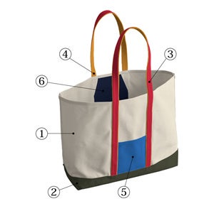 ①ボディ(本体) ②ボディ(底) ③持ち手(表) ④持ち手(裏) ⑤ポケット(外) ⑥ポケット(内)