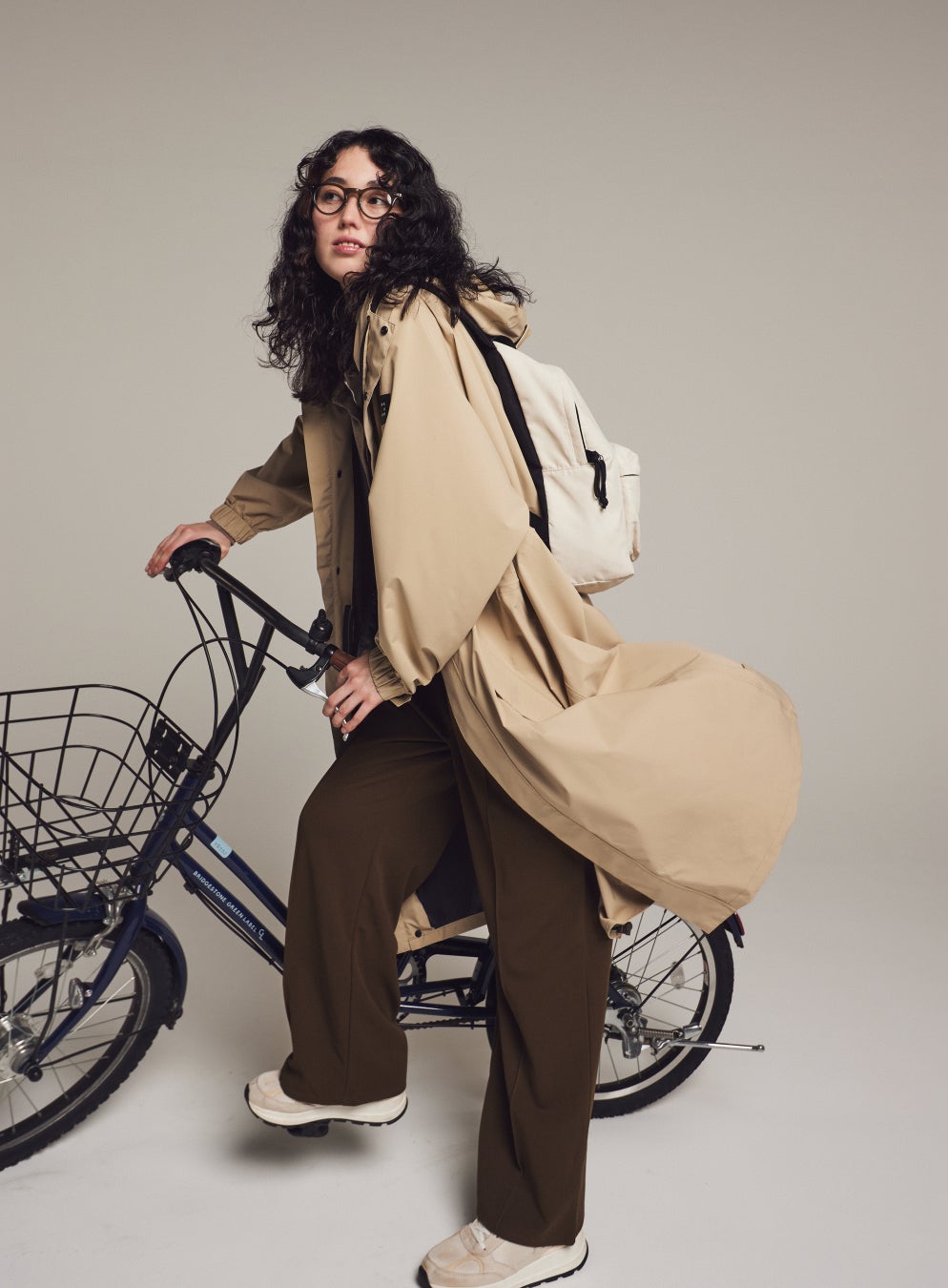 コートの前裾部分には、ジッパー開閉式の三角マチを搭載。雨の日の自転車で下半身への雨の侵入を防ぎ、また 風によるバタつきも抑えてくれるので、快適性と安全性が同時に増す、嬉しい機能です。