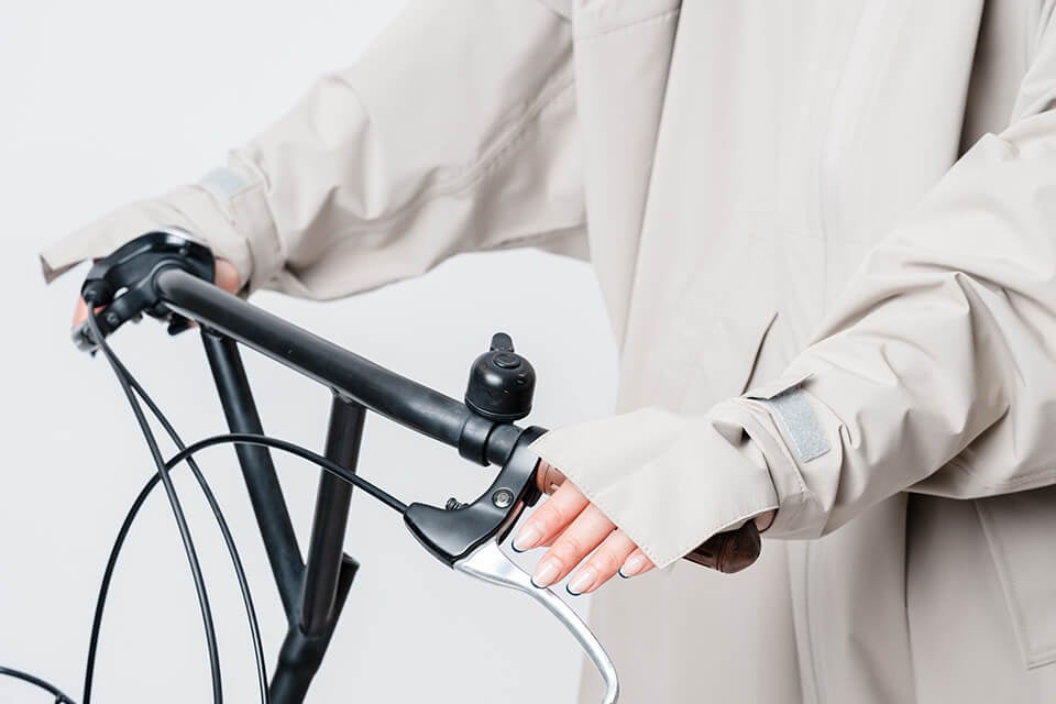 中指ループをつけていることで、腕周りのズレをふせぎます。運転のしやすさを万全にするため、細部までこだわった機能です。雨の侵入を防ぐうえでも、ボタンで手首を止めることができるようになっています。