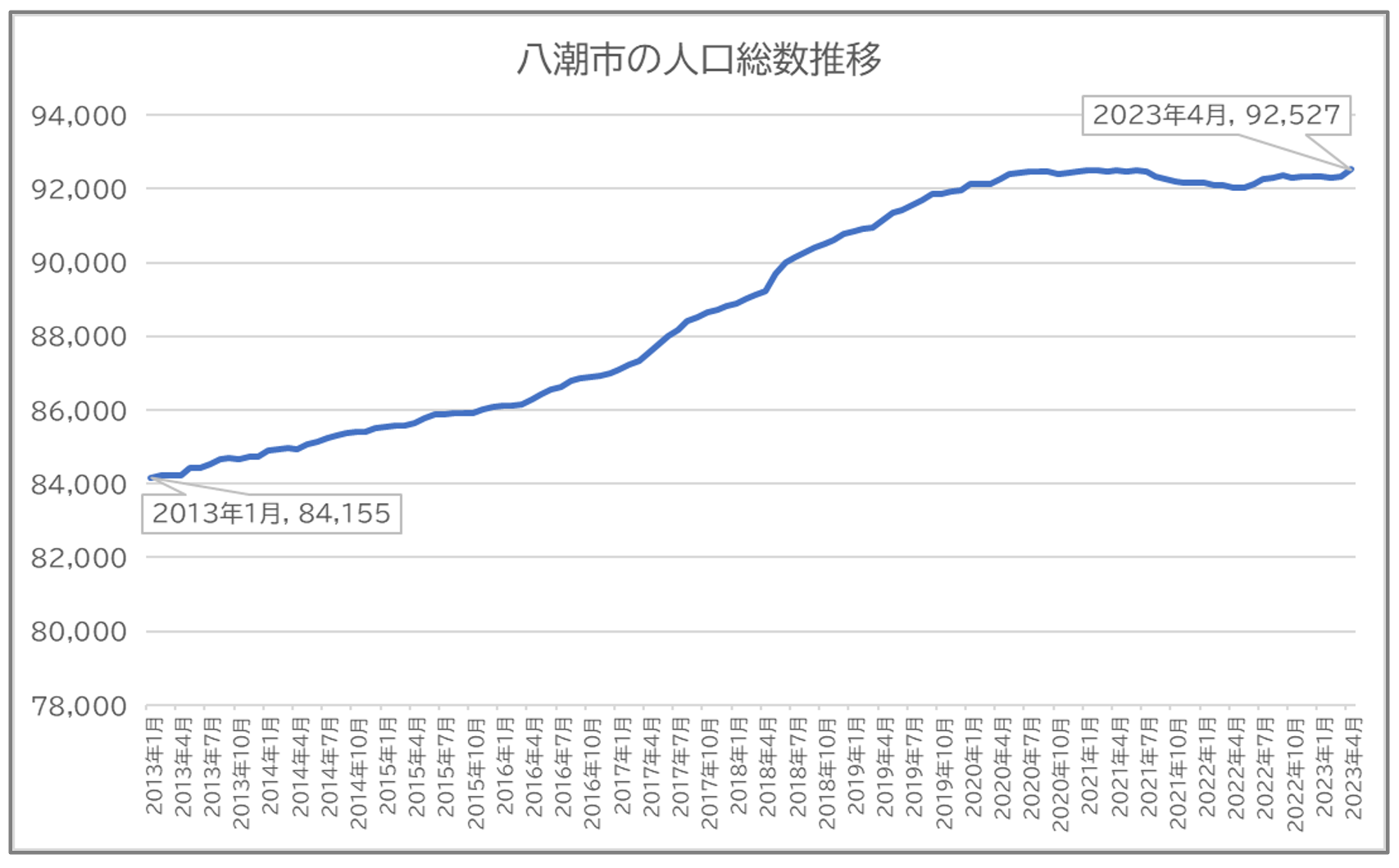首都高や外環道へのアクセスは元より、2005年のつくばエクスプレス開業と共に人口は増加傾向にあります。都内主要地まで約20分でアクセスできる利便性により、近年では単独世帯やニューファミリー層の流入が増加。 2015年の国勢調査によると八潮市の総人口は8万6717人、その後の八潮市からの発表では2023年4月現在は92,527人となっています。各市区町村ごとの人口増加率と比較すると、八潮市は埼玉県内でトップ10に入る増加率。