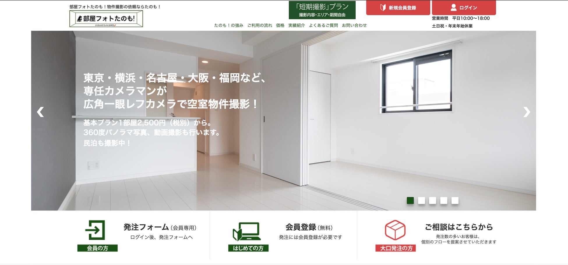 不動産会社様からのご依頼を基に低単価・高品質の物件撮影を行っております。撮影エリアは東京23区、横浜市、川崎市、名古屋市、京都市、大阪市、神戸市、芦屋市、西宮市、尼崎市、福岡市。超広角一眼レフカメラを持ったプロ・セミプロカメラマンが、1部屋2,500円(税別/月間50件以上年間契約の場合)より空室撮影に伺います。※福岡市については2,000円(税別)より