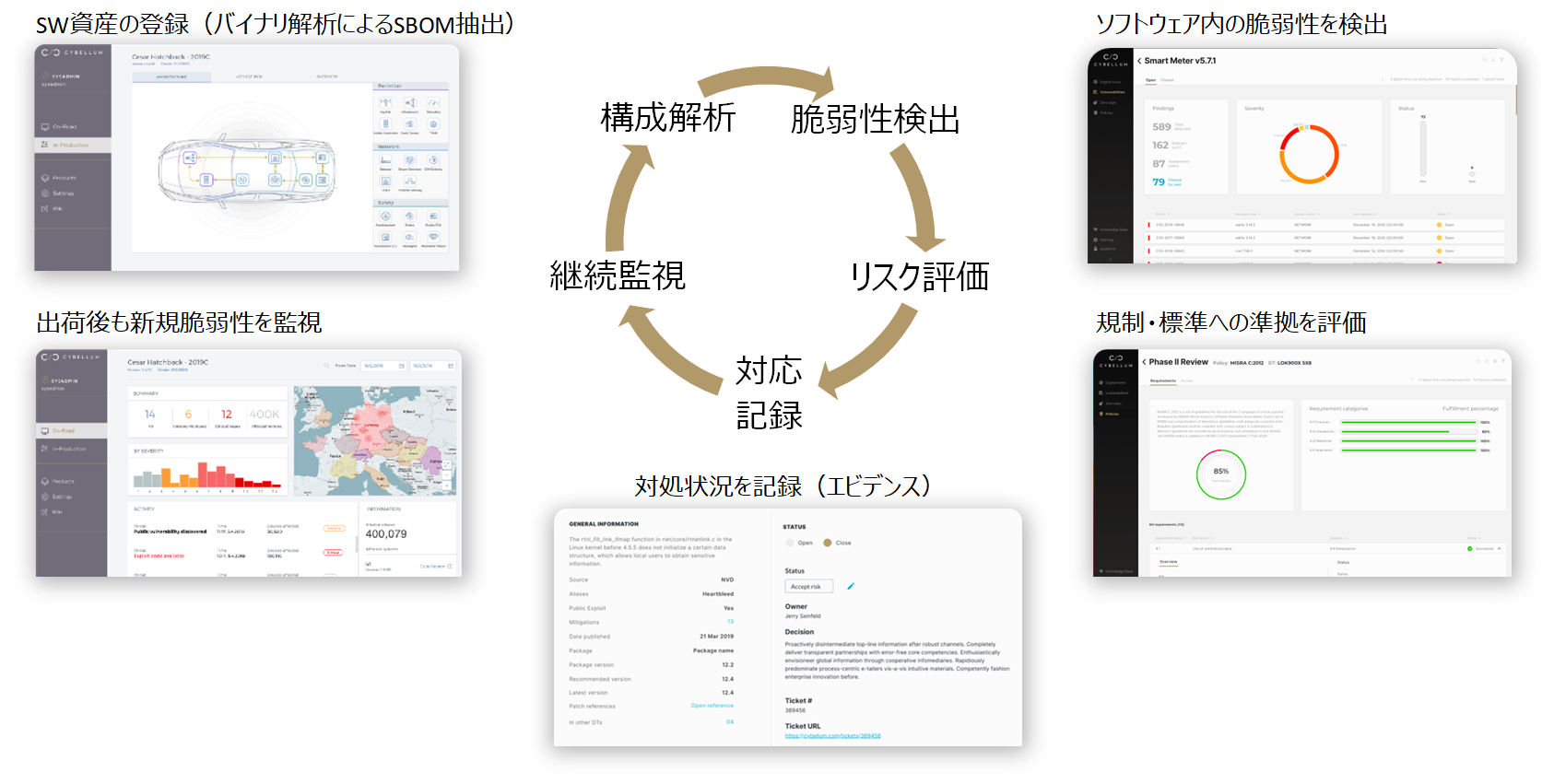 Cybellumが開発・販売している脆弱性管理ソリューション「Cybellum(サイベラム)」は、バイナリからSBOM (ソフトウェア部品表)を抽出し、サイバー脆弱性を自動検出・管理するツールです。さらに検出した脆弱性は一元管理。製品リリース後も脆弱性情報を自動でモニターするので、製品ライフサイクルを通した、継続的なサイバーリスク管理の負担を大幅に軽減します。