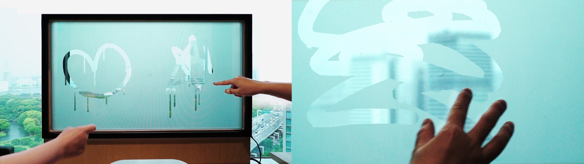 透明ディスプレイを使って擬似的に曇りガラスに指で落書きをする体験。結露した窓を実際に指や道具を使って触れたときに、水滴がじんわりと滲んだり雫が滴ったりする様子を楽しむことができるプロダクト。