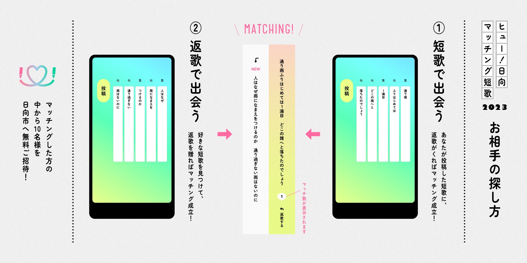 短歌(和歌)が古来「出会いの手段」であったことに着目し、恋人・友達・パートナーと出会う短歌のマッチングサービス『ヒュー!日向 マッチング短歌2023』をリリースし、2023年11月17日(金)から12月17日(日)まで期間限定で短歌を募集いたします。