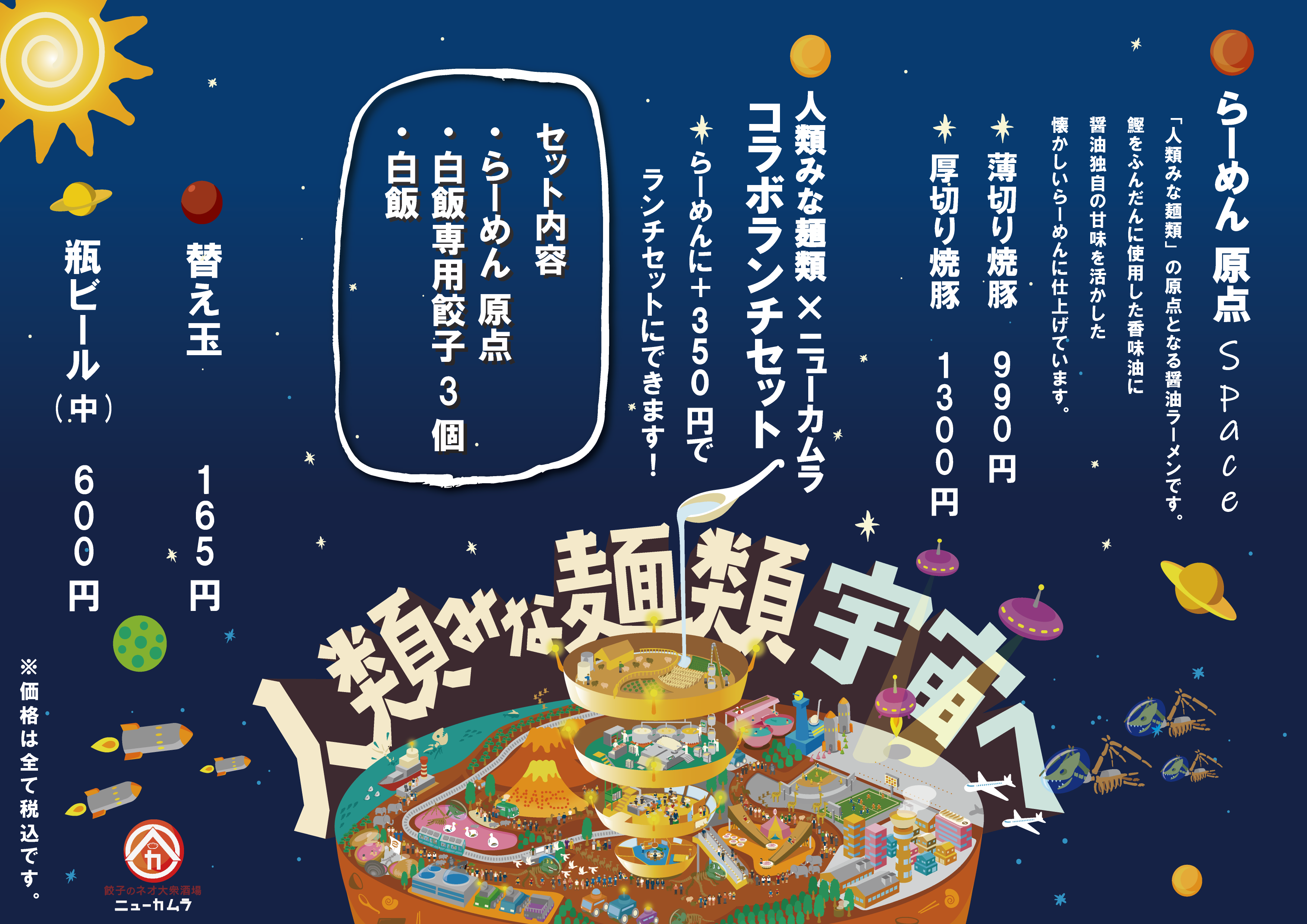 「人類みな麺類」の原点となる”醤油ラーメン”と「餃子のニューカムラ」の人気メニュー”白めし専用餃子”が一緒に味わえるお店です。