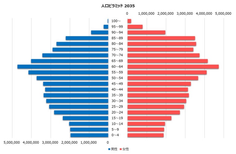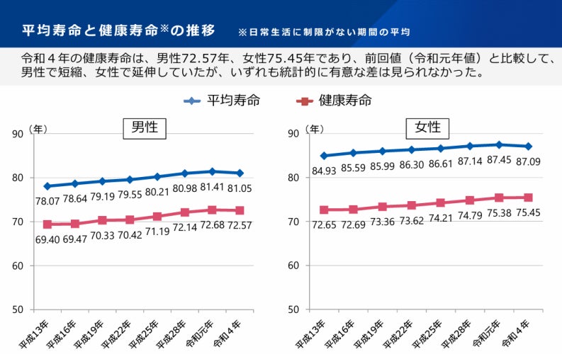 引用:総務省「統計ダッシュボード・2035人口ピラミッド」 出典:厚生労働省「健康寿命の令和4年値について」