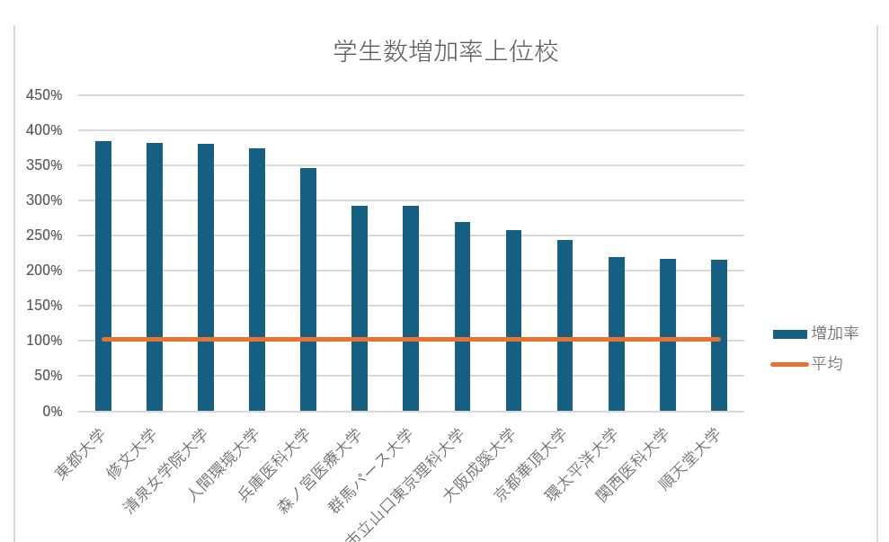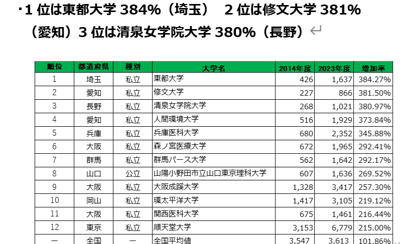3位は清泉女学院大学(長野県)380%、2位は修文大学(愛知県)381%、384%も伸ばした意外過ぎる大学とは・・・