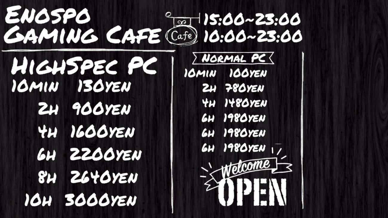オープニング記念で、ENOSPO公式Twitter(https://twitter.com/enospocafe)をフォローで、2時間以上のパックすべてに1時間無料&ワンドリンクが付きます!