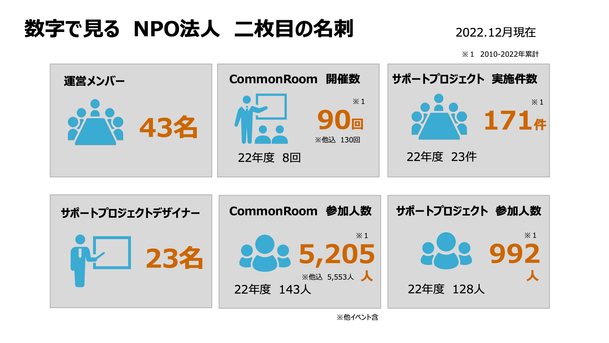 2009年に設立したこの組織は、今年で13年目を迎えました。2022年度は、サポートプロジェクトを23件実施し、総勢128名の方に活動いただきました。