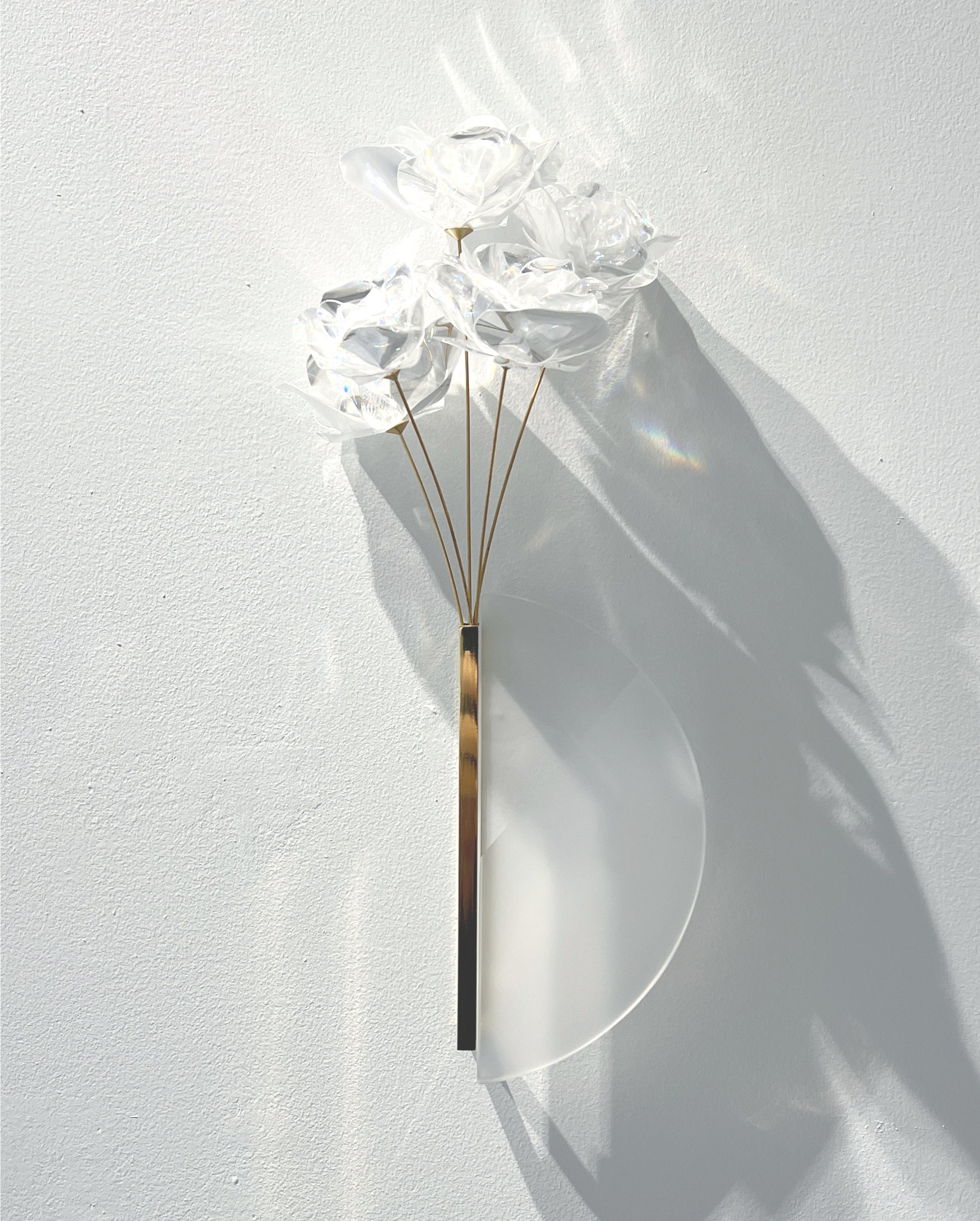 本展では「光の結晶化」をテーマに、現象として消えゆく形のない光やその輝きを、一つ一つアート作品として物質化し可視化します。白を基調とした空間のなかで、独自に扱う素材“プリズム光学樹脂”による《Prism Flower Wall》や、水のように極めて透明な質感の“クオーツガラス”による希少なオブジェを、本展のための新作として公開いたします。いずれも来場者がアートを身近に感じられるようなスタイルで、都市や建築、インテリア、パブリックスペースと融合する光のアートを提案します。