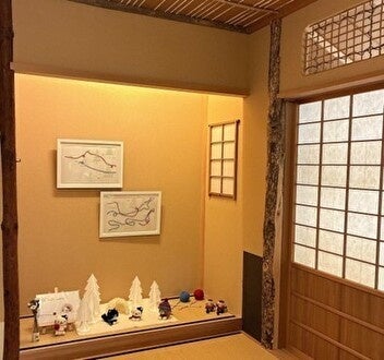 会場のお茶室には特別に絵本に登場するあみぐるみを展示し、物語の世界観を再現。