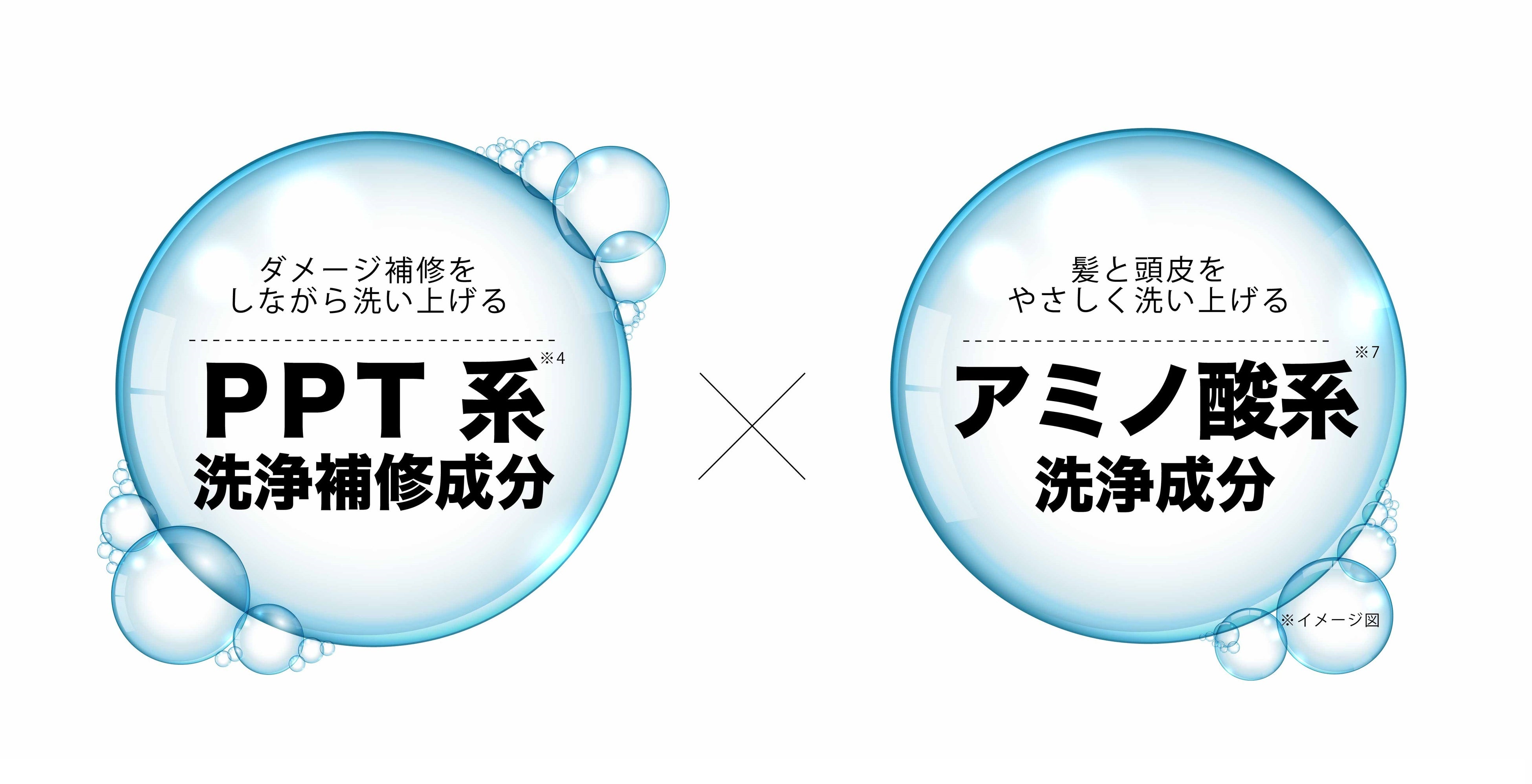 ダメージ補修をしながら洗い上げる2種類のPPT系※4と、髪と頭皮をやさしく洗い上げるアミノ酸系から厳選した3種類の洗浄成分※7をバランスよくブレンド。汚れを落とすことを主目的とするシャンプーでも、髪と頭皮をいたわりながら毛髪ダメージに徹底アプローチします。