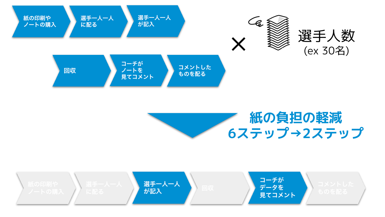 紙の練習ノートを使った選手の育成方法は、手間が多く、特に選手数の多いチームでの運用は現実的に困難です。BuildではITの強みを活かした仕組みにより6ステップある負担を2ステップに削減することができます。