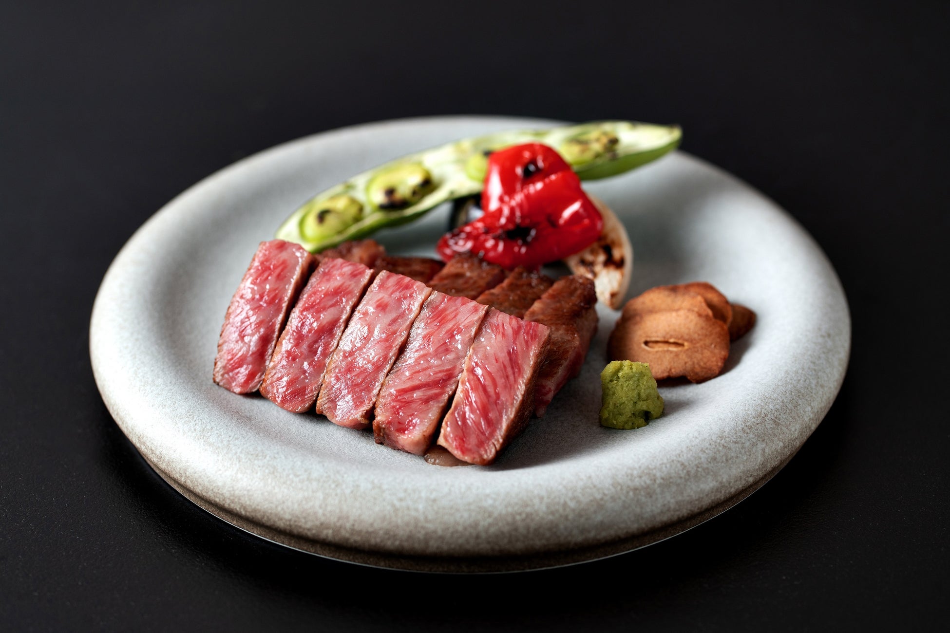 コースの冒頭から登場する黒毛和牛を使った炙り寿司。お客様の目の前でバーナーを使って炙るので、五感を刺激し、お食事が始まる前からライブ感をお愉しみいただけます。佐世保のレモンステーキを鉄板でアレンジした料理や、黒毛和牛を使ったひとくち餃子など、九州のソウルフードをニュー松坂ならではの提供の仕方で皆様にお届けします。