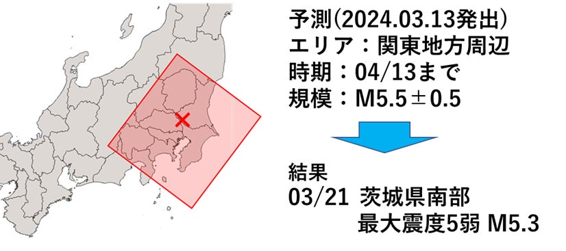 結果として、2024年3月21日に茨城県南部を震源とする最大震度5弱、マグニチュード5.3の地震が発生しました。JESEAの予測と実際の地震は、場所・時期・規模ともに合致する結果となりました。