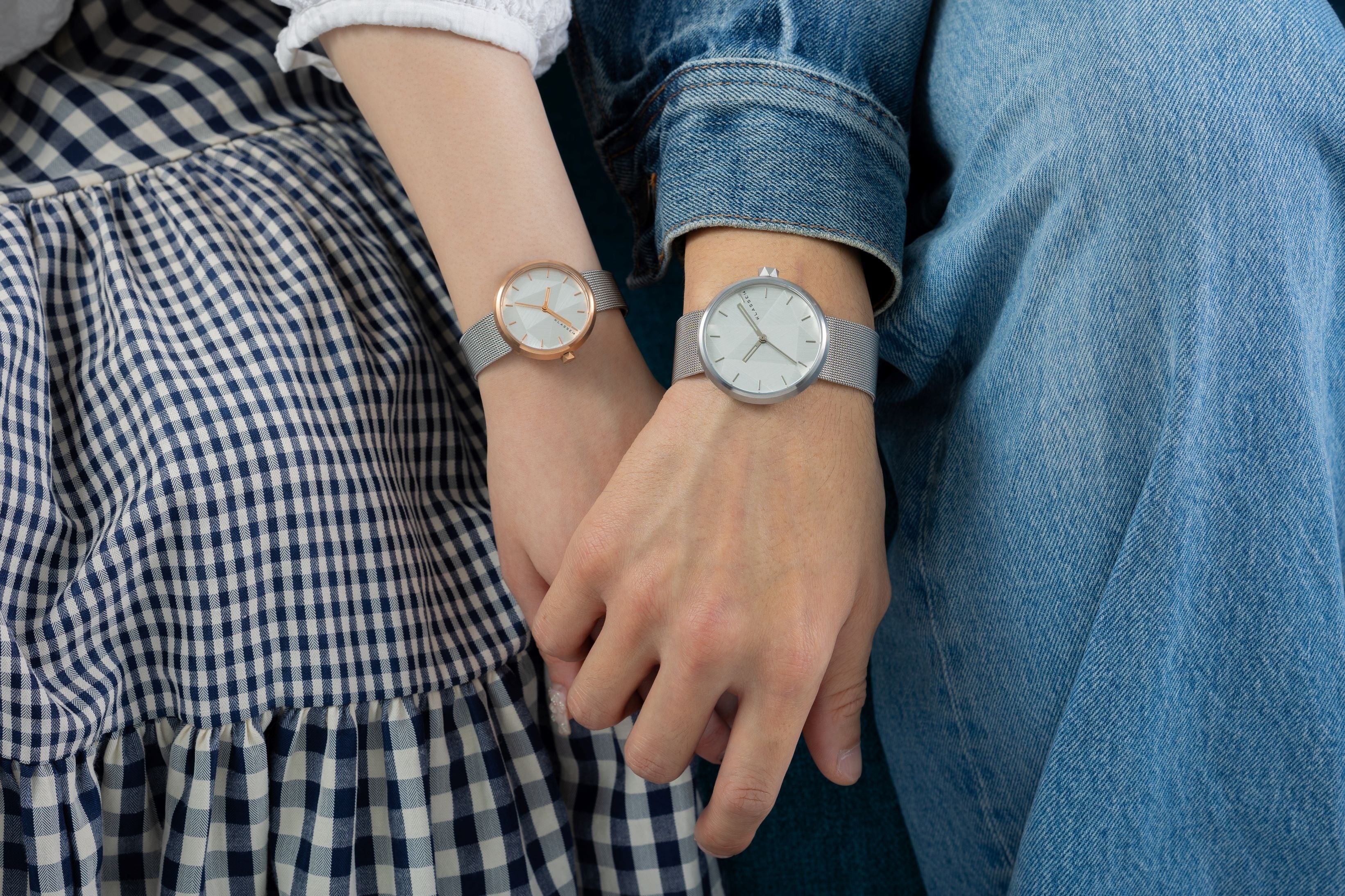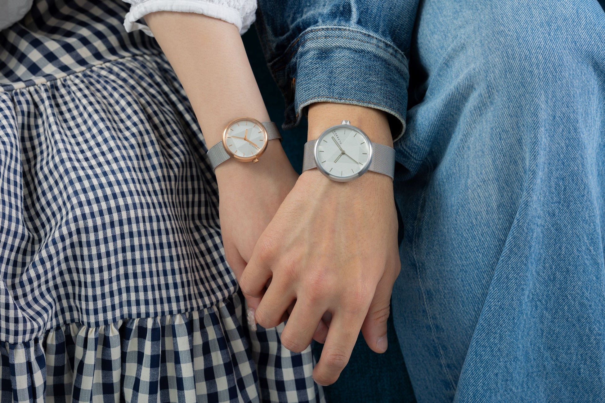 ケースサイズは32㎜/40㎜の展開、ケース・針・インデックスはサイズ違いでChampagneGold・All Silverを採用。ペアウォッチとしてもオススメです◎