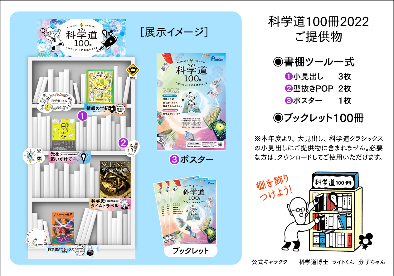 「科学道100冊2022」を開催したい図書館・教育機関・各種団体を募集しています。参加団体へは書棚ツール一式とブックレットを無償で提供いたします。