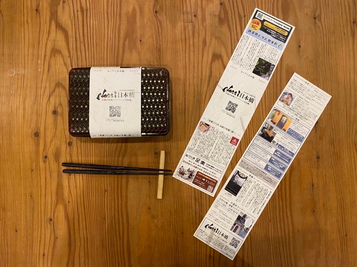 広告としては、非常にピンポイントで狭いセグメントへのアプローチにはなりますが、たくさんのエリアを細分化することで、地域ごとに密接な広告効果を得る媒体として、また弁当への『熨斗巻き』をしていただける協力飲食店にはNOSSI日本橋掲載企業から一部配布手数料をお渡しする事で、地域を一緒に盛り上げ、また近隣のお客様にアプローチができて来店につながる様な媒体にしていきます。