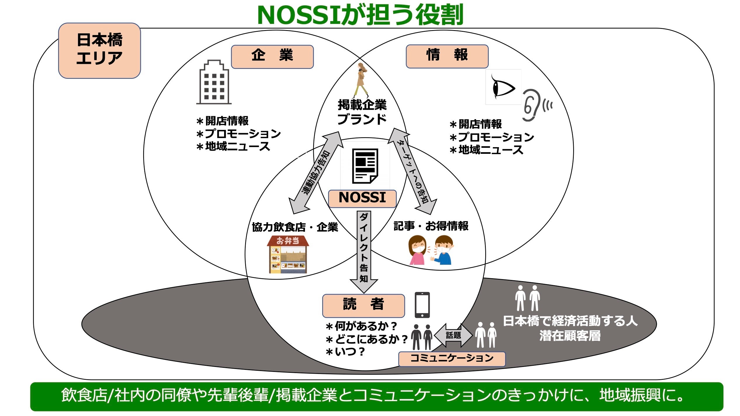 NOSSI日本橋は会社帰りに寄れるお店紹介や、画像に一言投稿してもらうような読者参加型コーナーを設置し、日々の業務のことだけでなく、同僚や先輩と『雑談』から始まるコミュニケーションでの何気ない時間を『共有』して欲しい、そう願い誕生しました。