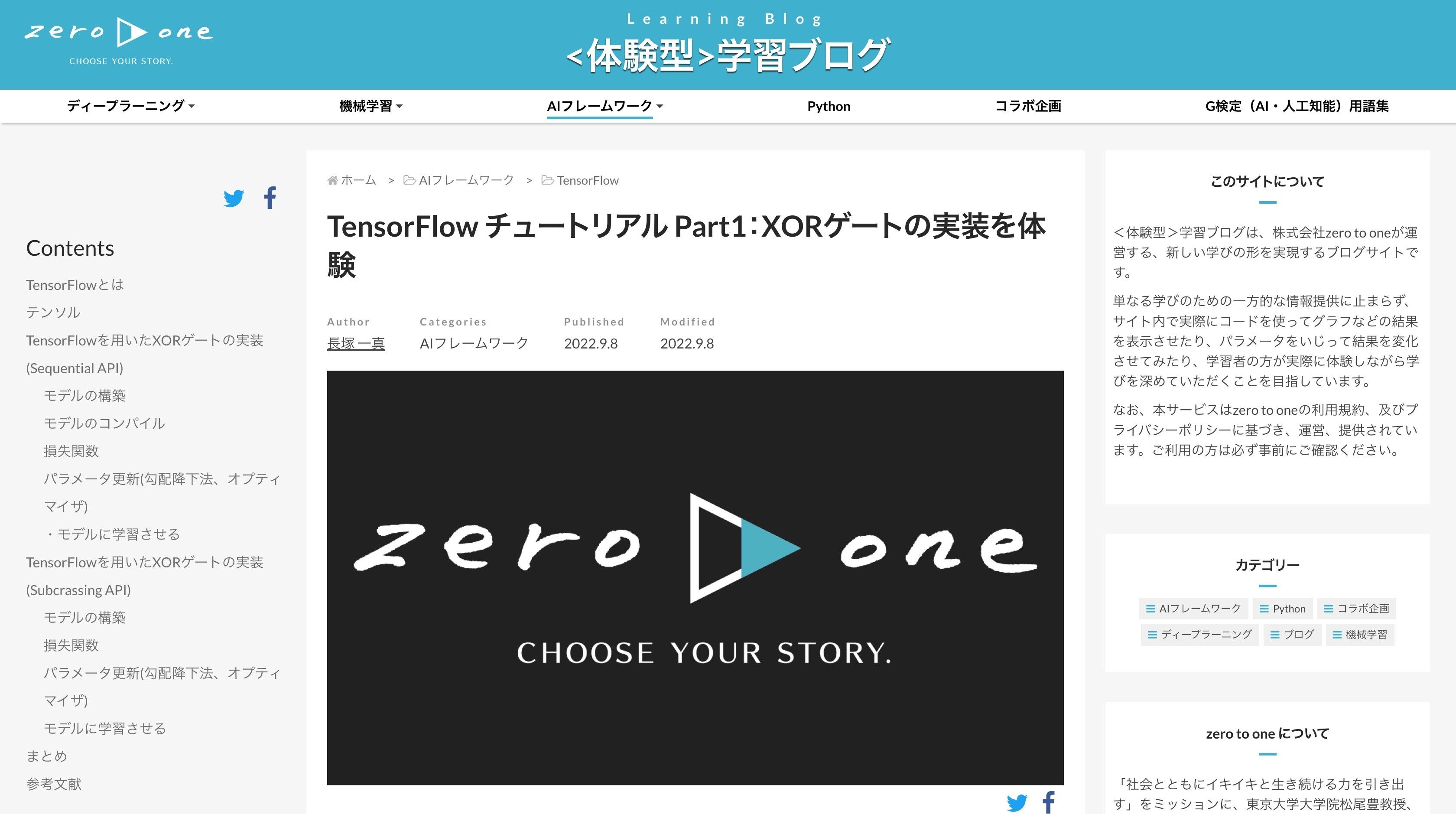 zero to oneは、「社会とともにイキイキと生き続ける力を引き出す」をミッションに、東京大学大学院松尾豊教授、東北大学大学院岡谷貴之教授など有識者を顧問に迎え、昨今社会に必要とされるAIやデジタル分野の教育コンテンツを中心に提供しています。2017年にリリースした非同期型の完全オンライン教材「機械学習」を皮切りに、これまでに8つのオンライン教材をリリースし、上場企業を中心にのべ400社、10,000名以上のAI/デジタル人材育成を推進してまいりました。この度は、通常30〜100時間程度の学習時間が必要とされる従来のオンライン教材とは別の形での学習手段を提供すべく、ブログ形式のテキストや図表を用いた説明に加えて、学習者の方が実際に体験しながら学びを深めていただくことができる新サービスを開発、無償にて提供を開始します。
